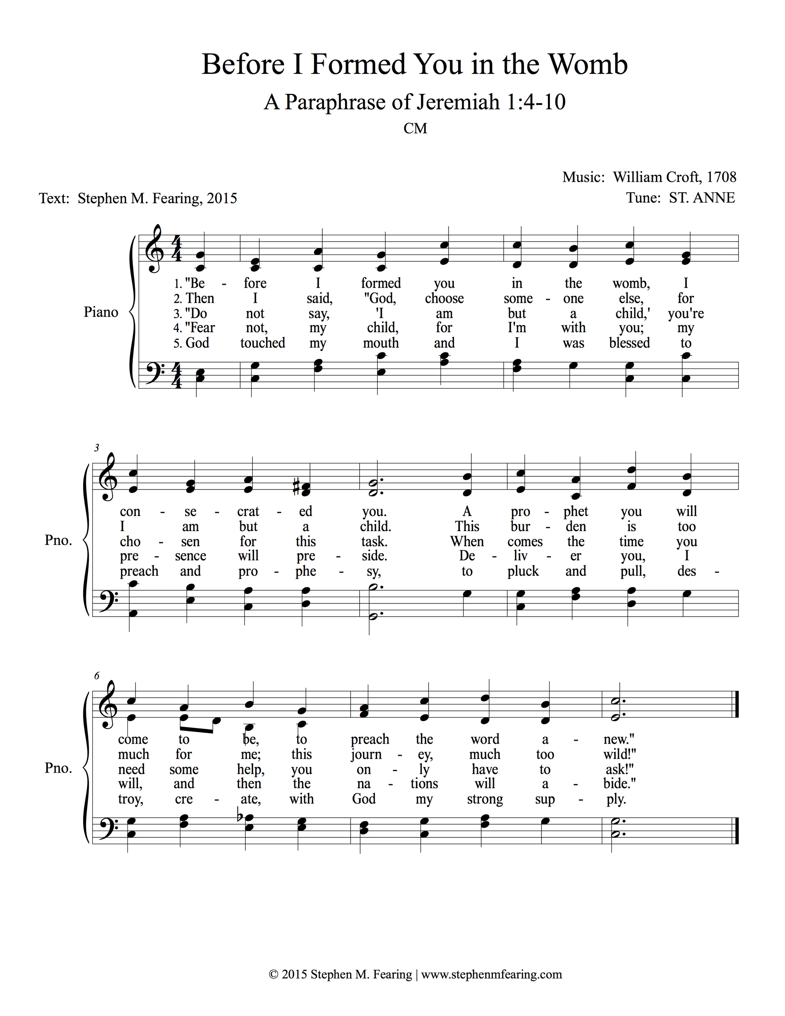 /Here's a hymn inspired by Jeremiah 1:4-10 (which shows up Epiphany 4C). It is written in CM (8.6.8.6) and can be sung to the tune ST. ANNE, which is commonly used to sing "O God, Our Help in Ages Past").